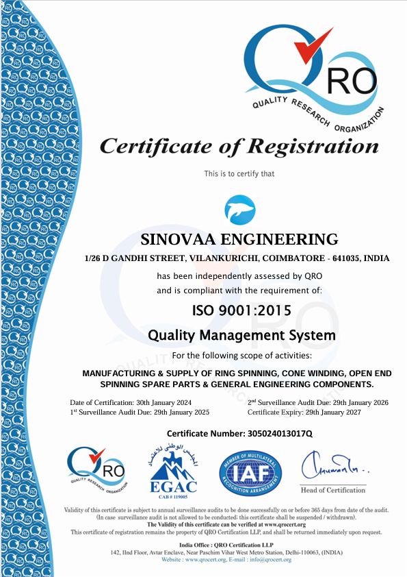Sinovaa Engineering Pvt Ltd is a precision manufacturing company based in Coimbatore, Tamil Nadu, specializing in high-quality textile spinning machine parts and engineered spares for compact and autodoffer systems. The company focuses on delivering reliable, performance-driven components through advanced reverse engineering, 3D modeling, and vision measurement technologies. With strong expertise in injection-moulded and precision-engineered products, Sinovaa Engineering serves the evolving needs of the textile industry by ensuring accuracy, durability, and cost efficiency. Its commitment to innovation, quality standards, and customer satisfaction has positioned the company as a trusted supplier in both domestic and international textile machinery markets.